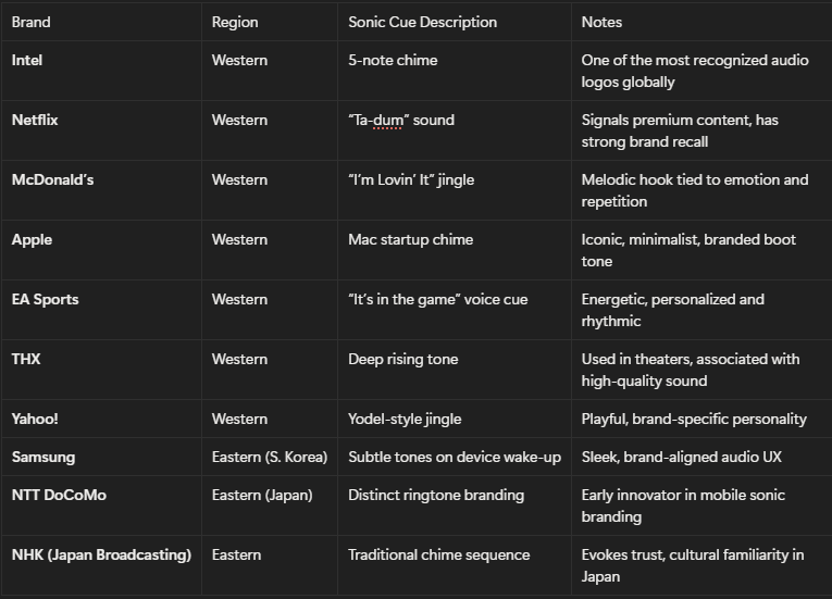 Research into sonic branding revealed that sound plays a vital role in creating accessible and emotionally resonant brand experiences, particularly for users who cannot rely on visual elements. Iconic audio logos like Netflix's "ta-dum," EA Sports' "It's in the game," and Intel's five-note chime demonstrate how simple, consistent, and emotionally charged sound cues build brand recognition and user trust. Scholarly research including Spence's The Power of Sonic Branding and Minsky and Fahey's Audio Branding reinforces that auditory elements enhance memory, orientation, and emotional impact. Cross-cultural studies reveal that sound perception varies globally, suggesting future sonic brand identities should consider regional context.