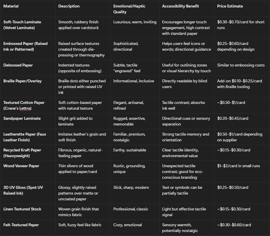 Tactile design has emerged as a powerful tool for building emotionally resonant and accessible brand experiences. The focus was on identifying everyday materials — textured paper, embossed patterns, and soft-touch finishes — that provide compelling haptic feedback while remaining affordable and scalable. These insights directly informed the tactile business card prototype, which emphasizes orientation, recognition, and inclusive communication through deliberate texture hierarchy.