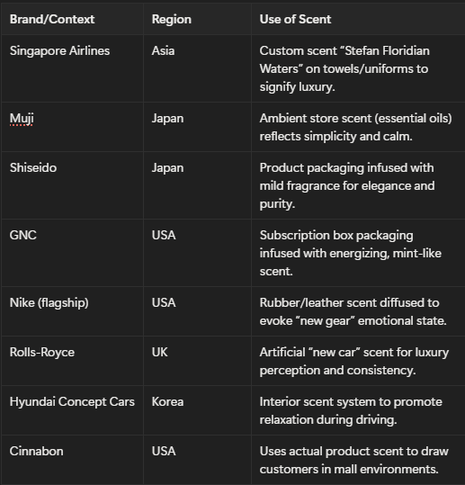Research into scent branding revealed that olfactory cues play a powerful and underutilized role in creating memorable brand experiences, especially when visual or auditory elements are limited. Brands like Singapore Airlines and GNC demonstrate how scent reinforces identity and builds long-term emotional connections. Studies including Krishna's Customer Sense and Spence's Multisensory Branding emphasize scent's unique ability to bypass conscious processing and directly influence mood and brand loyalty. Cost analysis shows scent branding can be implemented affordably through microencapsulation, paper-based scent cards, or ambient diffusion, making it viable for businesses of any size. Cross-cultural differences in scent associations underscore the need for sensitivity and localization in olfactory design.