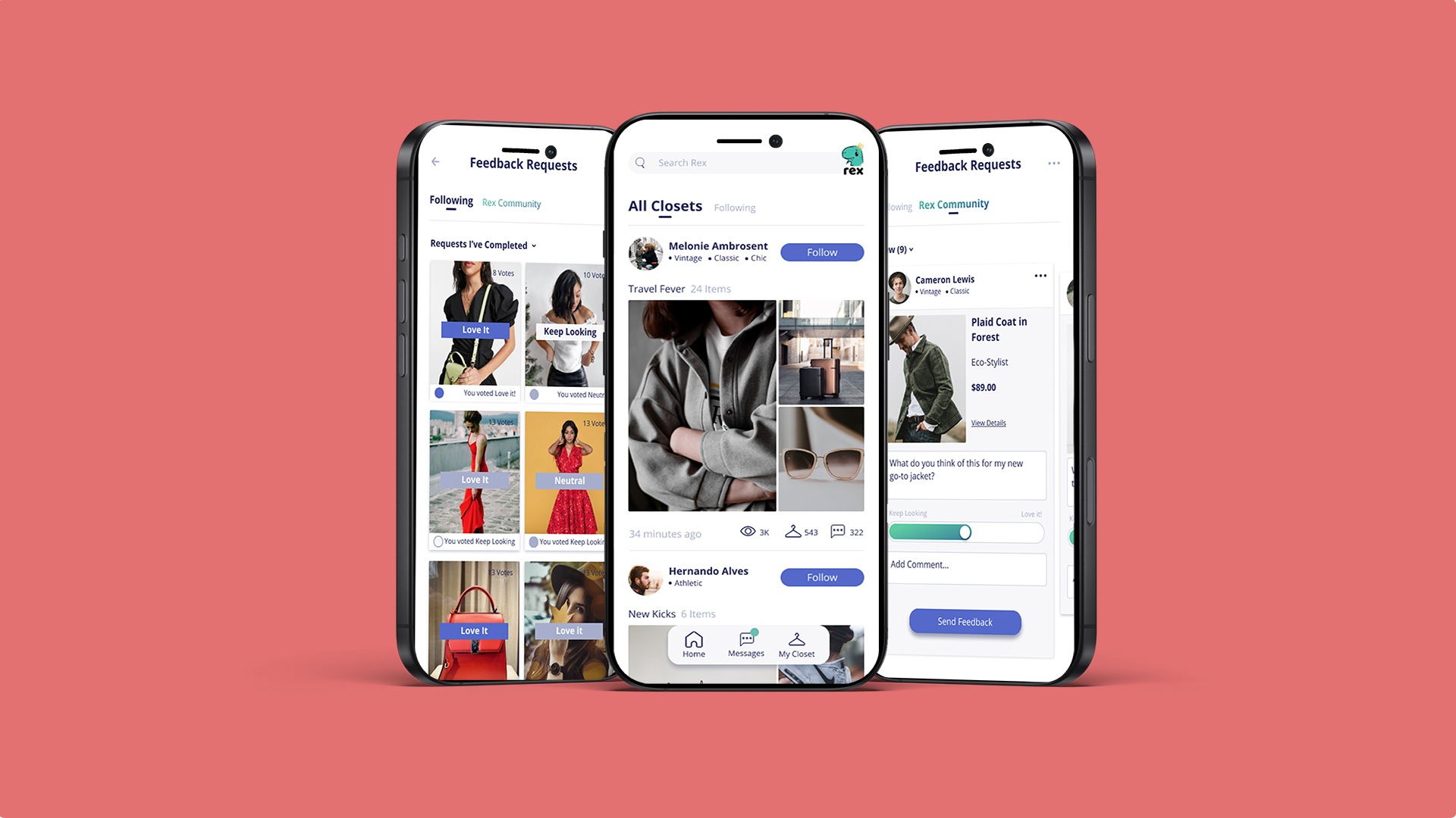 REX is a social shopping assistant that connects users with their friends and trusted networks to discover, organize, and get feedback on fashion items across the web. The core concept was built around a simple human insight: people rarely shop in isolation. They text screenshots to friends, share wishlists, and seek opinions before buying. REX was designed to make that social layer a native part of the shopping experience rather than a workaround happening across multiple disconnected platforms.