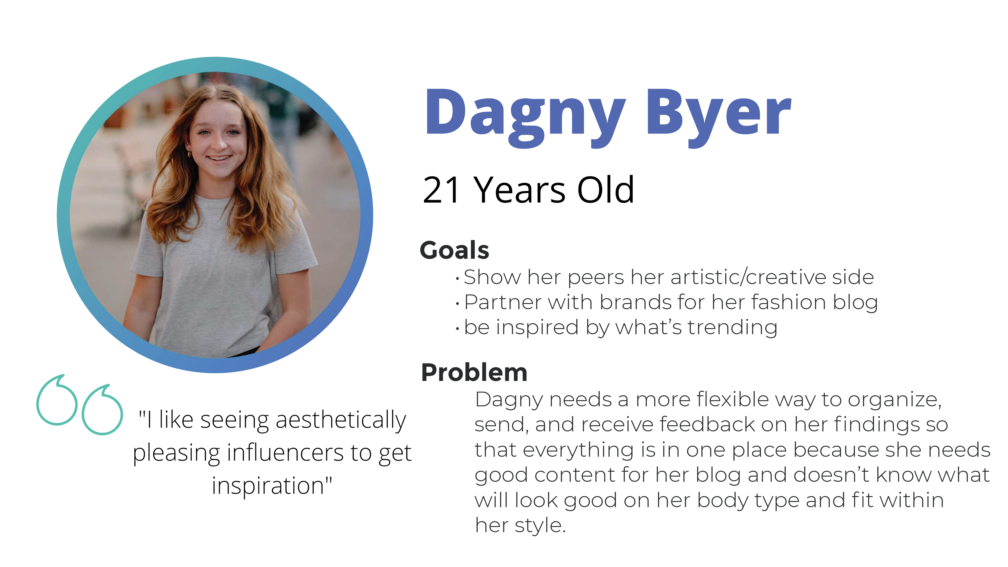Dagny, 21, was a fashion blogger who needed to organize inspiration from multiple sources and get feedback from her network in one place. Her journey map revealed she was using notes apps, screenshots, and manual tracking just to manage her research process — friction REX could directly eliminate.