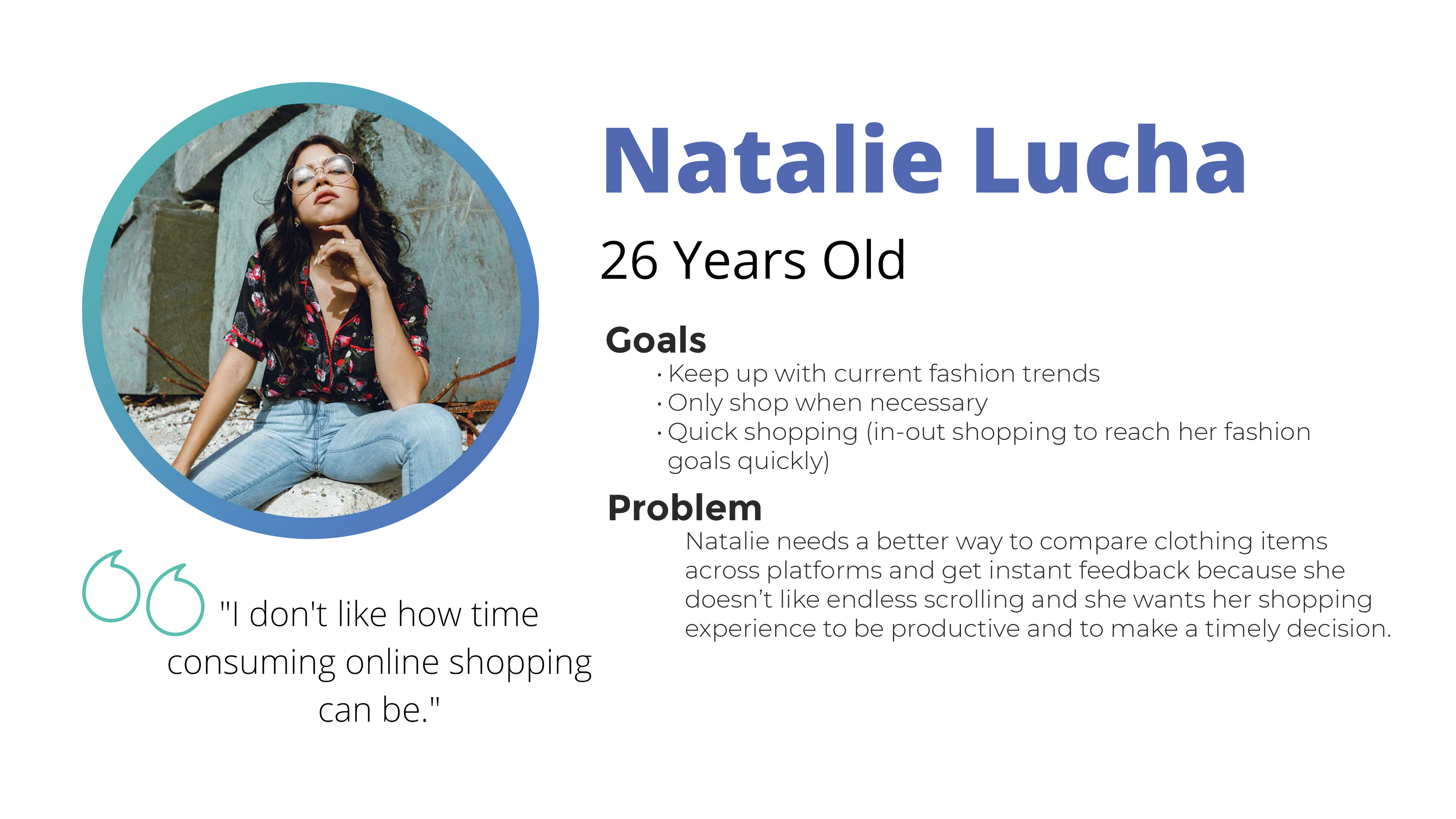 Natalie, 26, was a purposeful shopper who found online shopping too time-consuming. She needed fast cross-platform comparison and instant feedback without endless scrolling.
