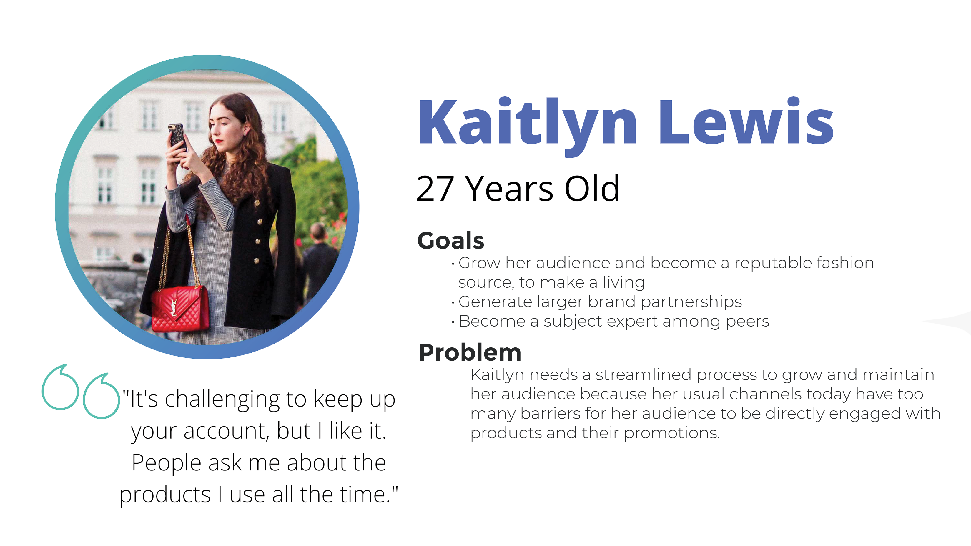 Kaitlyn, 27, was a fashion influencer trying to grow her audience and brand partnerships. Her primary barrier was that existing platforms created too many friction points between her content and her audience's ability to engage with and purchase the products she featured.