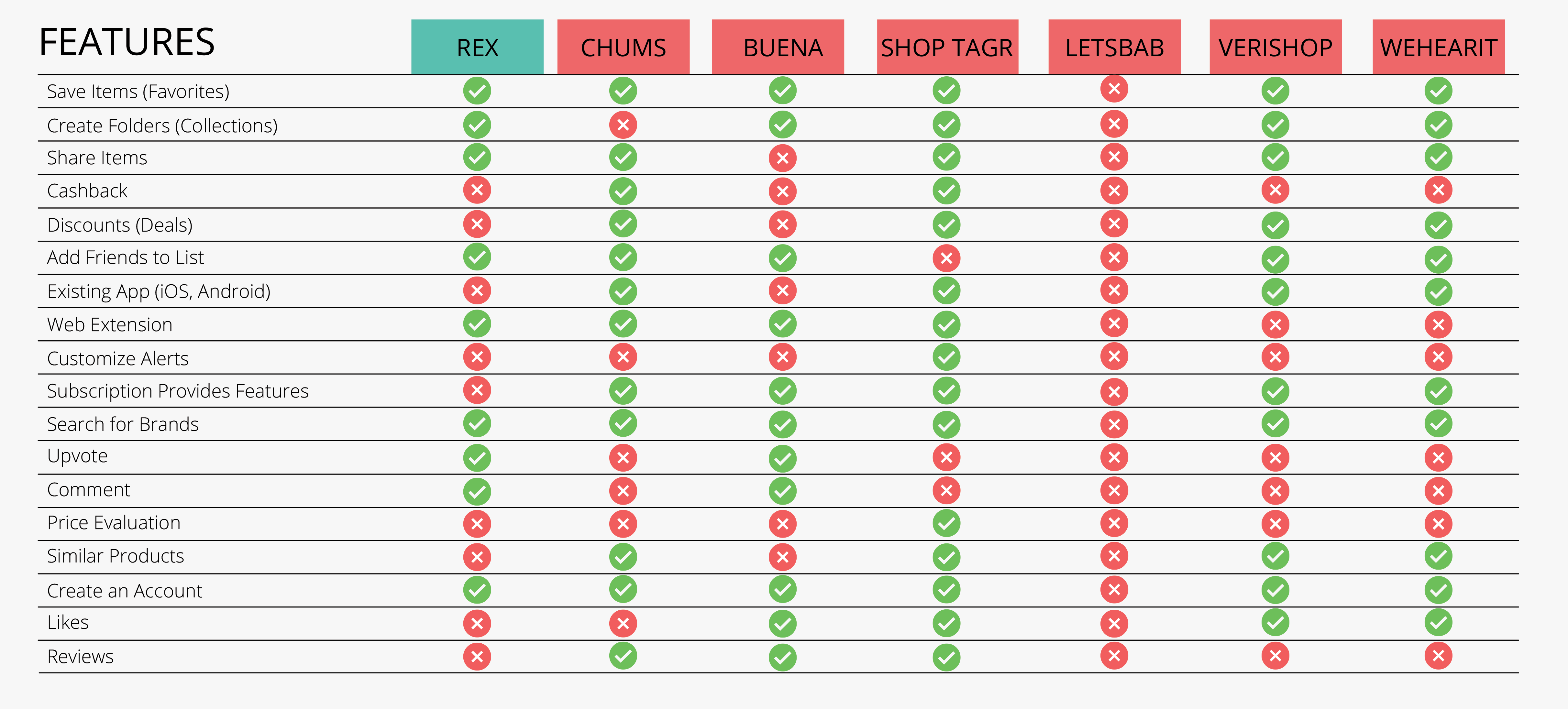 Seven competitor platforms were evaluated across 18 feature criteria including social sharing, collections, cashback, notifications, and browser extension availability. The analysis identified that no single competitor combined social feedback, cross-platform saving, and influencer tools in one product, validating REX's core positioning.
