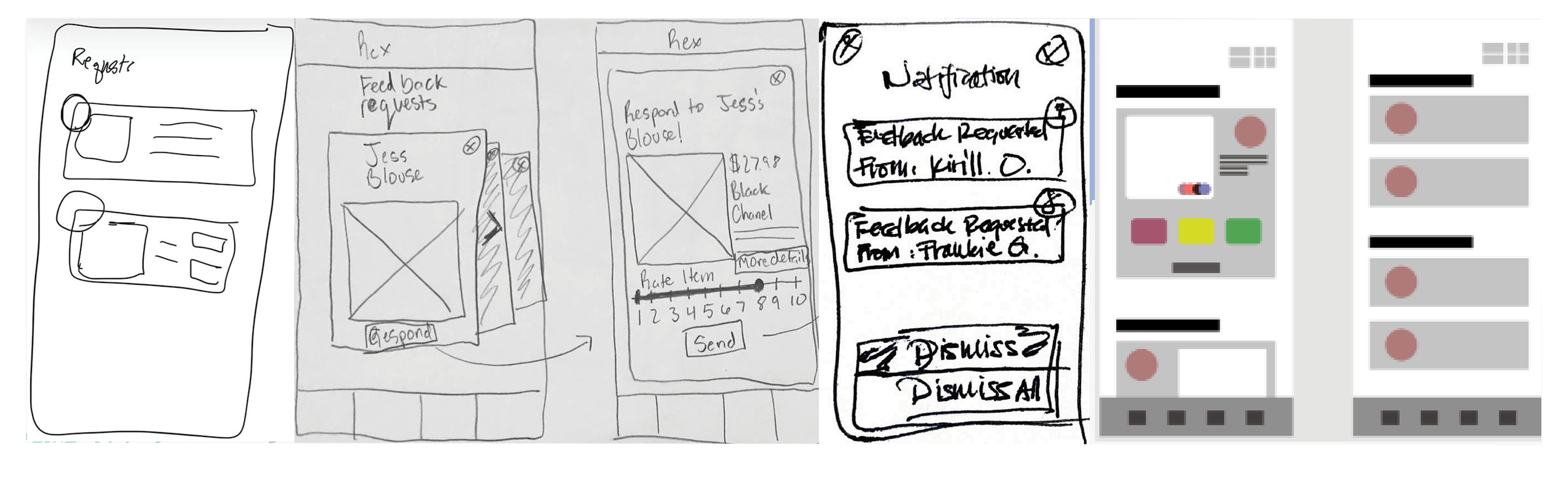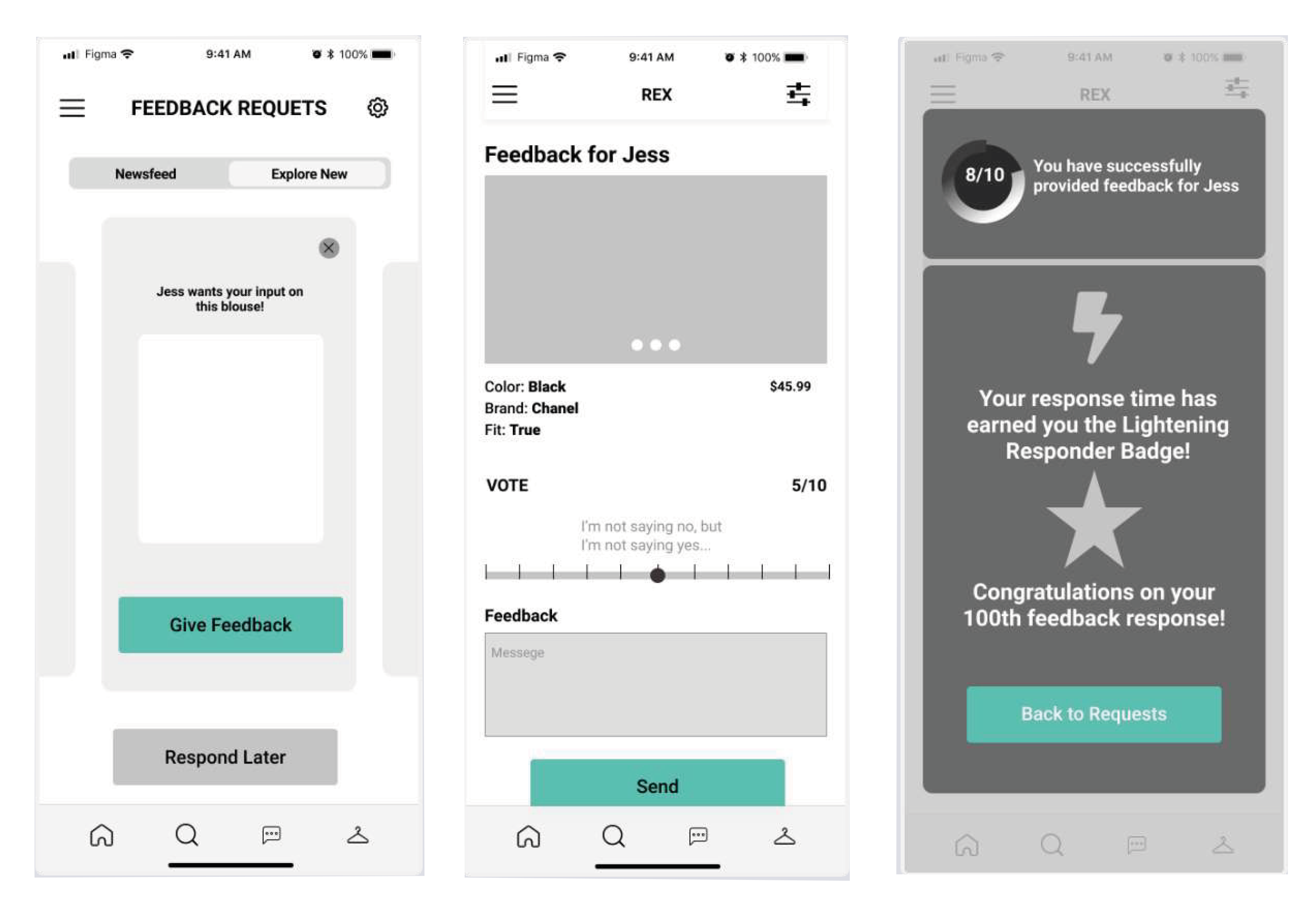The second prototype directly addressed both concerns from round one. The 0-to-10 voting scale was replaced with a Keep Looking / Love It slider and an emoji-based quick response system, reducing the social friction of giving negative feedback. The feedback request flow was redesigned to integrate within a messages-style inbox rather than a separate module, making it feel more native to how users already communicated.