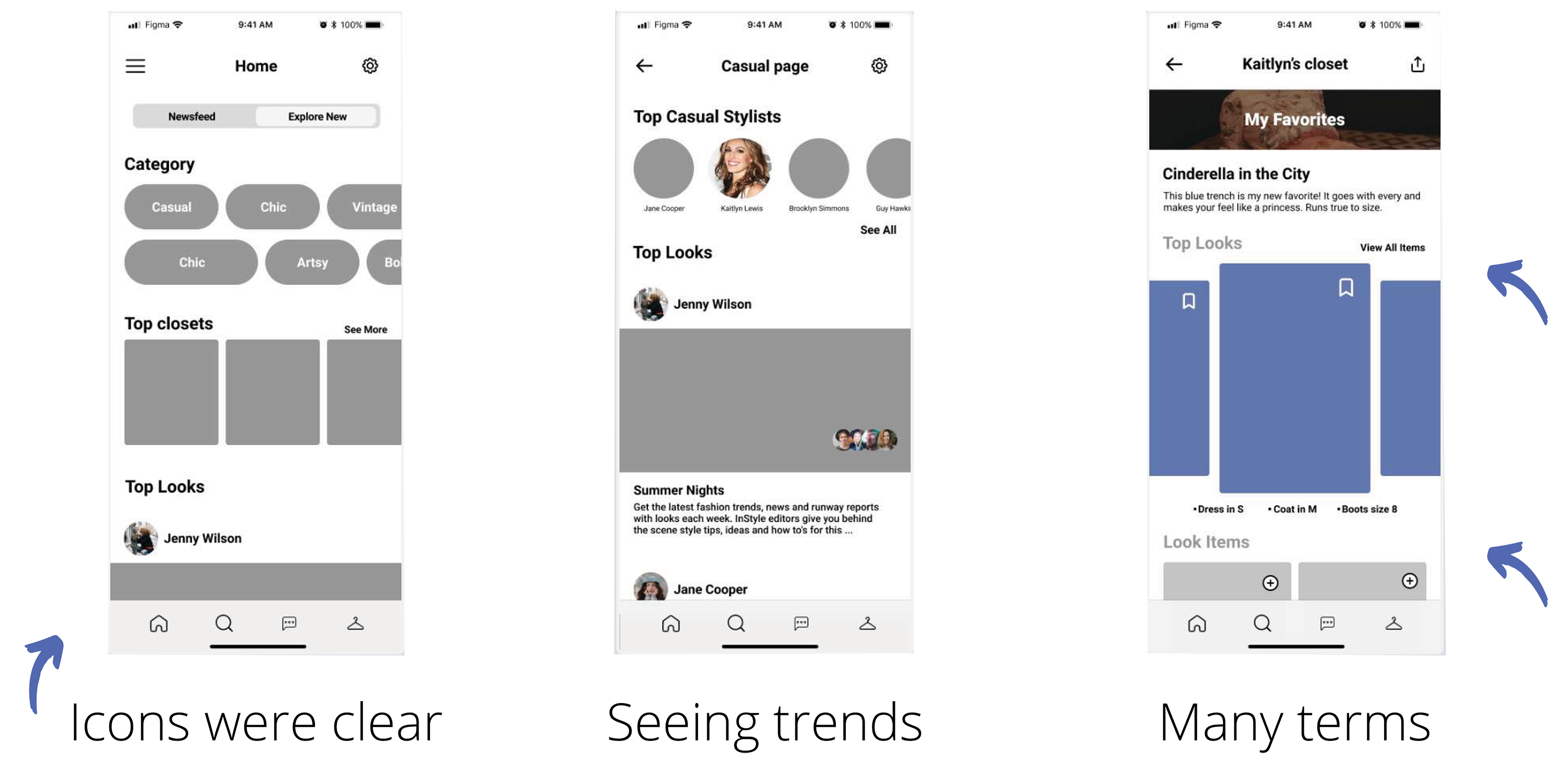 The first prototype established the core navigation structure, home feed, category browsing, closets, and a feedback request flow using a 0-to-10 voting scale. Usability testing surfaced two primary concerns: users found it difficult to get their existing friends onto a new platform, and the numeric voting scale felt socially harsh when giving low scores. On the positive side, icons and navigation were validated as clear and intuitive, and the trend discovery feed resonated strongly with participants.
