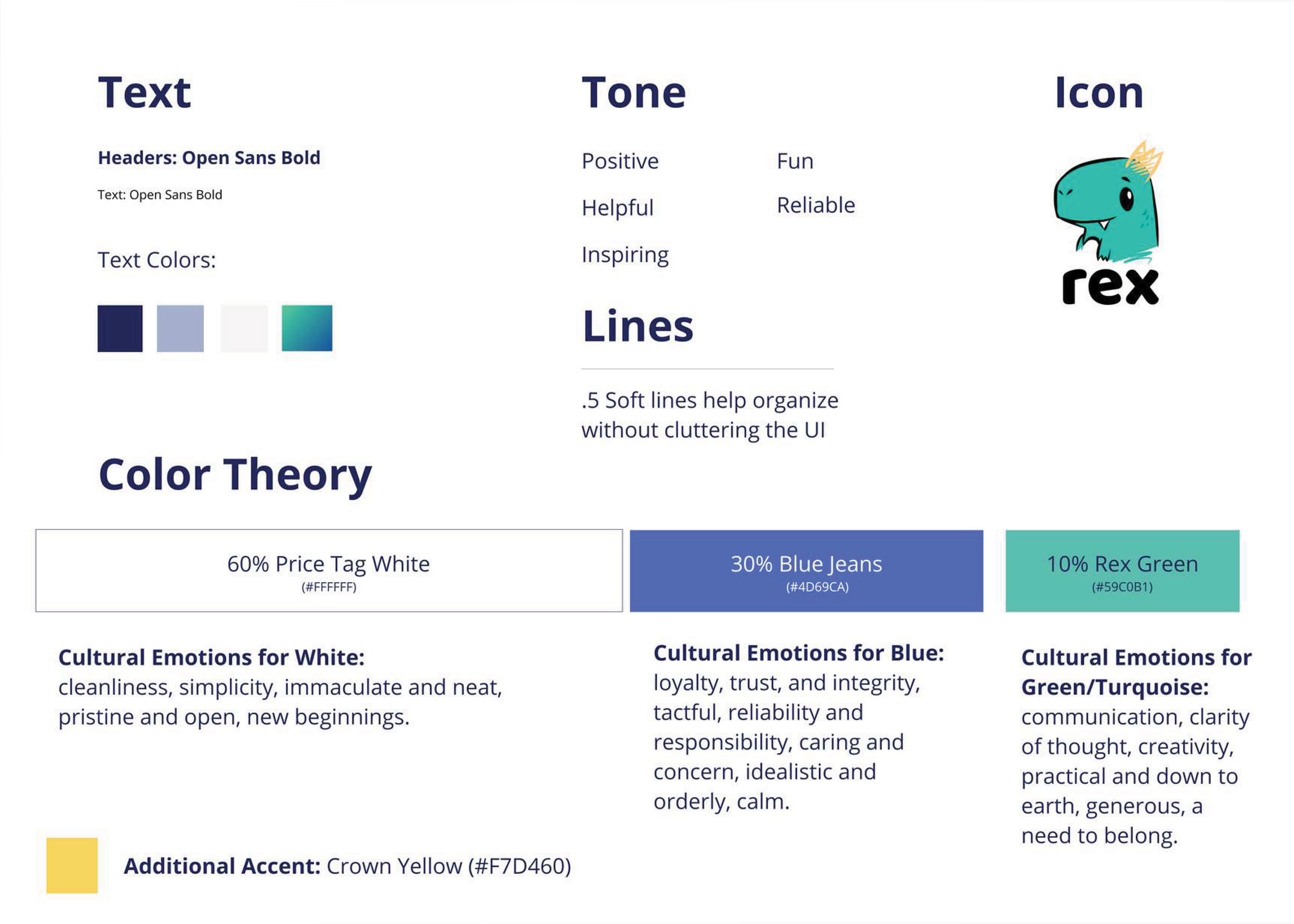 The final design system was built around three primary colors with intentional psychological grounding. Price Tag White at 60% established cleanliness and simplicity. Blue Jeans navy at 30% communicated loyalty, trust, and reliability. Rex Green at 10% added energy and creativity as an accent. Crown Yellow was defined as a secondary accent tied to the REX mascot and reward states. Typography used Open Sans Bold throughout for both headers and body text. Line weights of 0.5pt were used throughout to organize the UI without visual clutter. Brand tone was defined across five qualities: positive, helpful, inspiring, fun, and reliable.