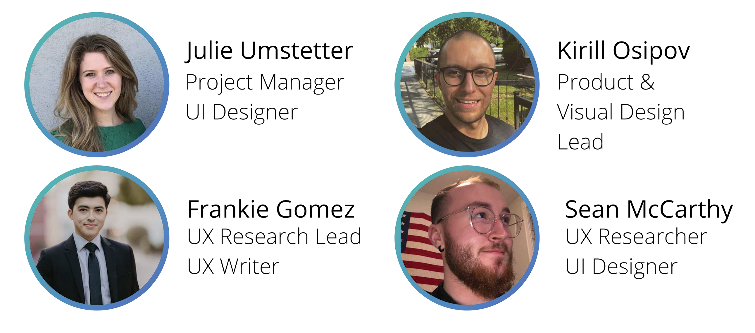 REX was a cross-functional UX team of four. I served as UX Researcher and UI Designer, contributing to user interviews, competitive analysis, and UI design across both prototype rounds. The team also included a Project Manager and UI Designer, a Product and Visual Design Lead, and a UX Research Lead and UX Writer.